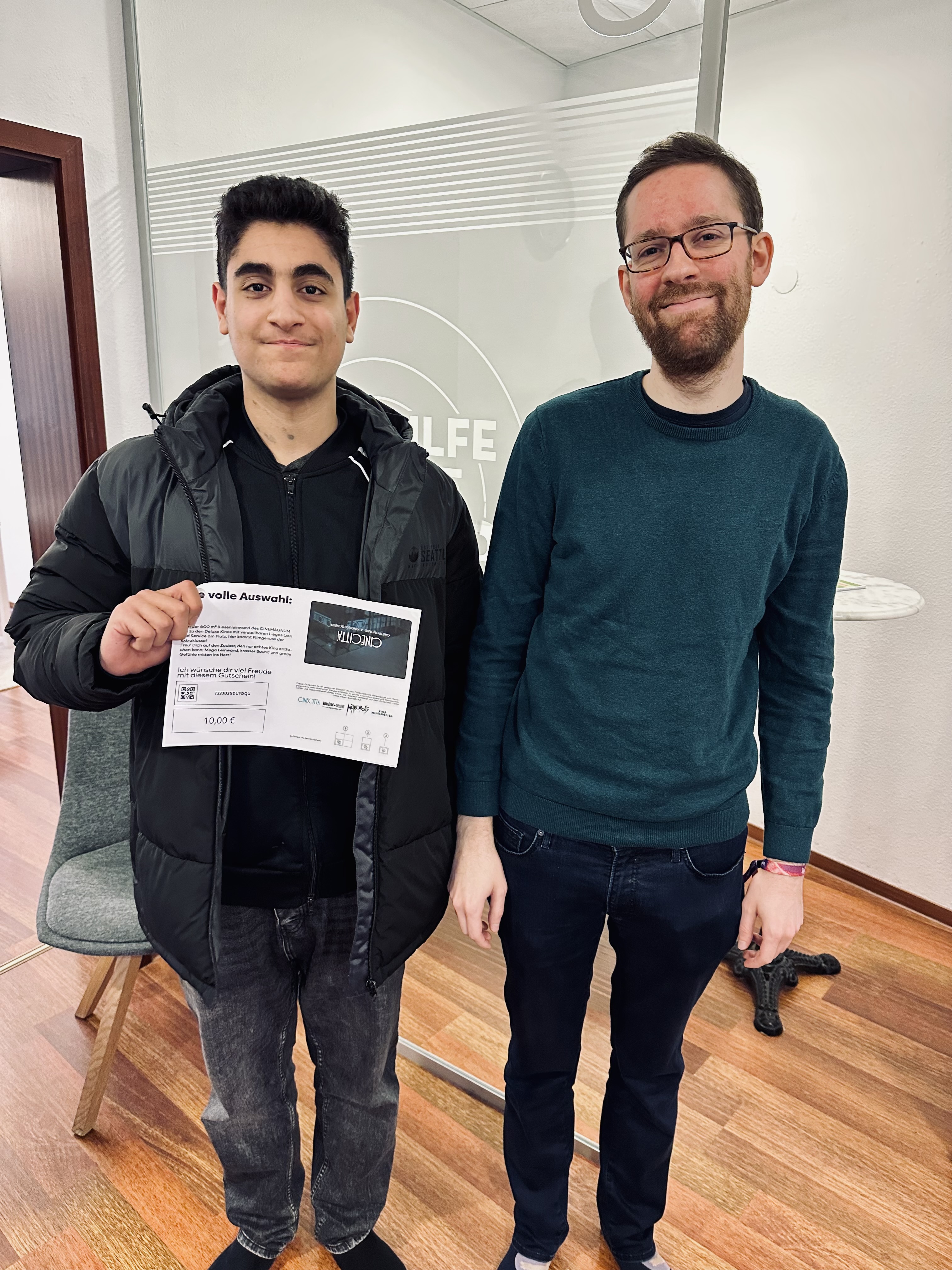 Hadi (links im Bild neben seinem Coach Sebastian) ist unser Schüler des Monats Dezember dank super Ergebnisse in Mathematik. Als Glückwunsch gibt es Kinokarten. Viel Spaß!